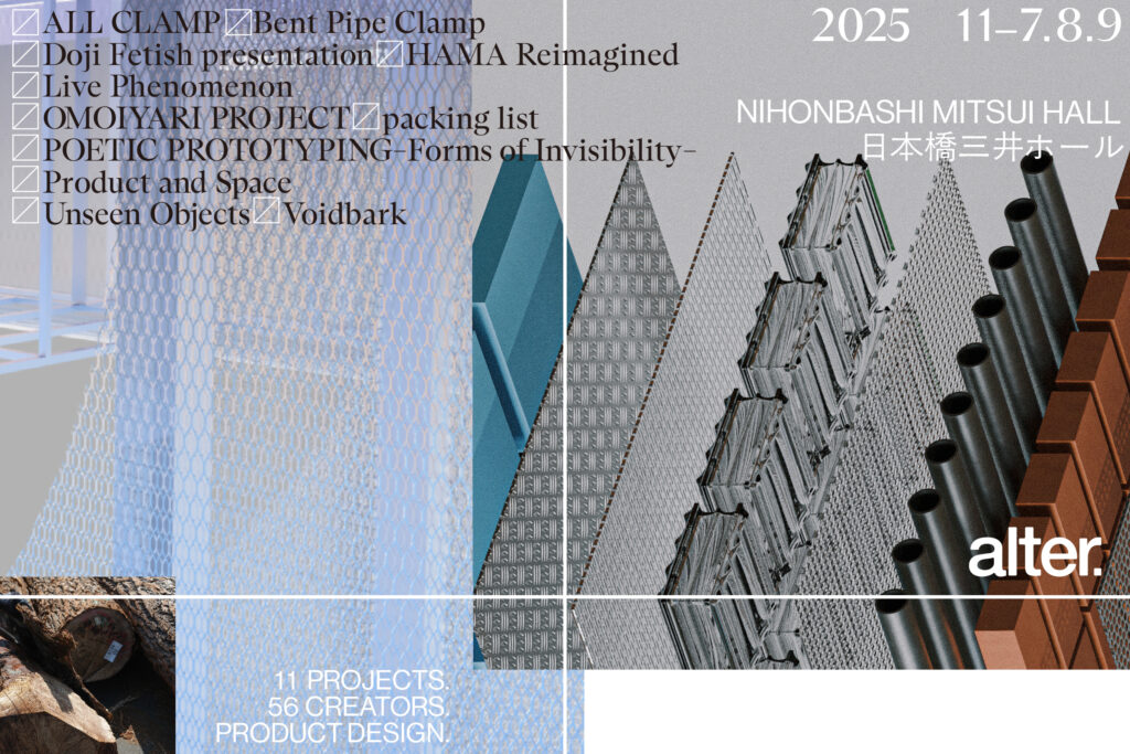 「alter.」は、次世代を担う多様な領域のクリエイターによるプロトタイピングやコラボレーションを促進し、オルタナティブなプロダクトデザインのあり方を提示する実験的なデザインイベントであり、既存の価値観や表現方法に新たな視点を提示するデザイナーやアーティストが集う、注目度の高いデザインエキシビジョンです。グローバルのデザインシーンを牽引するコミッティメンバーに選抜された11組のプロジェクト、計56名のクリエイターがプロダクト展示を行います。